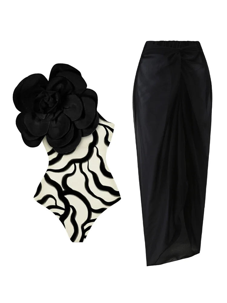 This elegant one-piece swimsuit features a striking 3D white floral embellishment, blending pure minimalism with bold romance. Its clean solid color and sculptural details create a sophisticated and unforgettable beachside look.