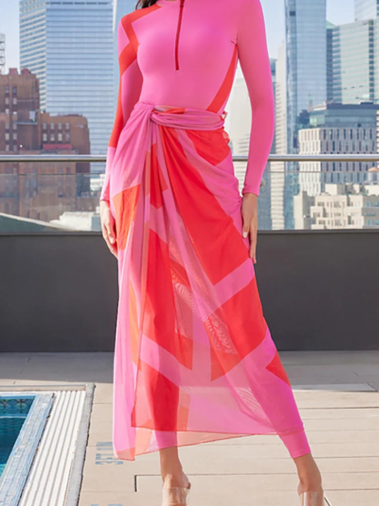 Make waves in this sporty-chic long sleeve one-piece swimsuit, designed with bold colorblock panels and a streamlined fit. Perfect for active beach days, it blends surf-ready function with a stylish, modern edge.