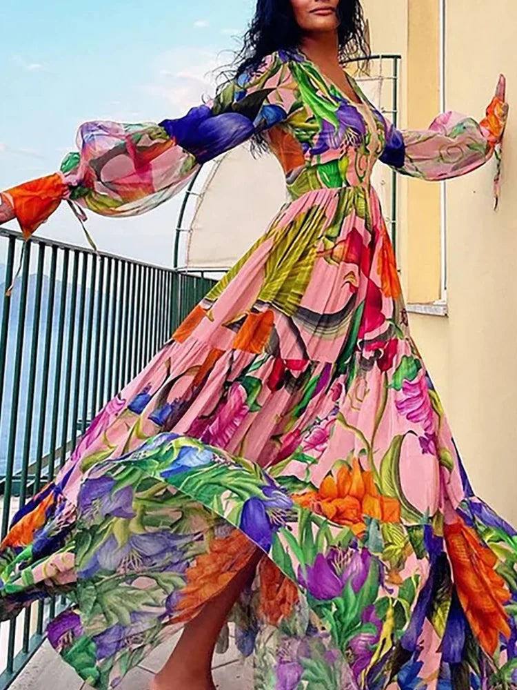 Make a bold statement with this deep V-neck one-piece swimsuit featuring dramatic lantern sleeves and vibrant resort-style prints. A perfect blend of fashion and function, designed for unforgettable beach escapes.