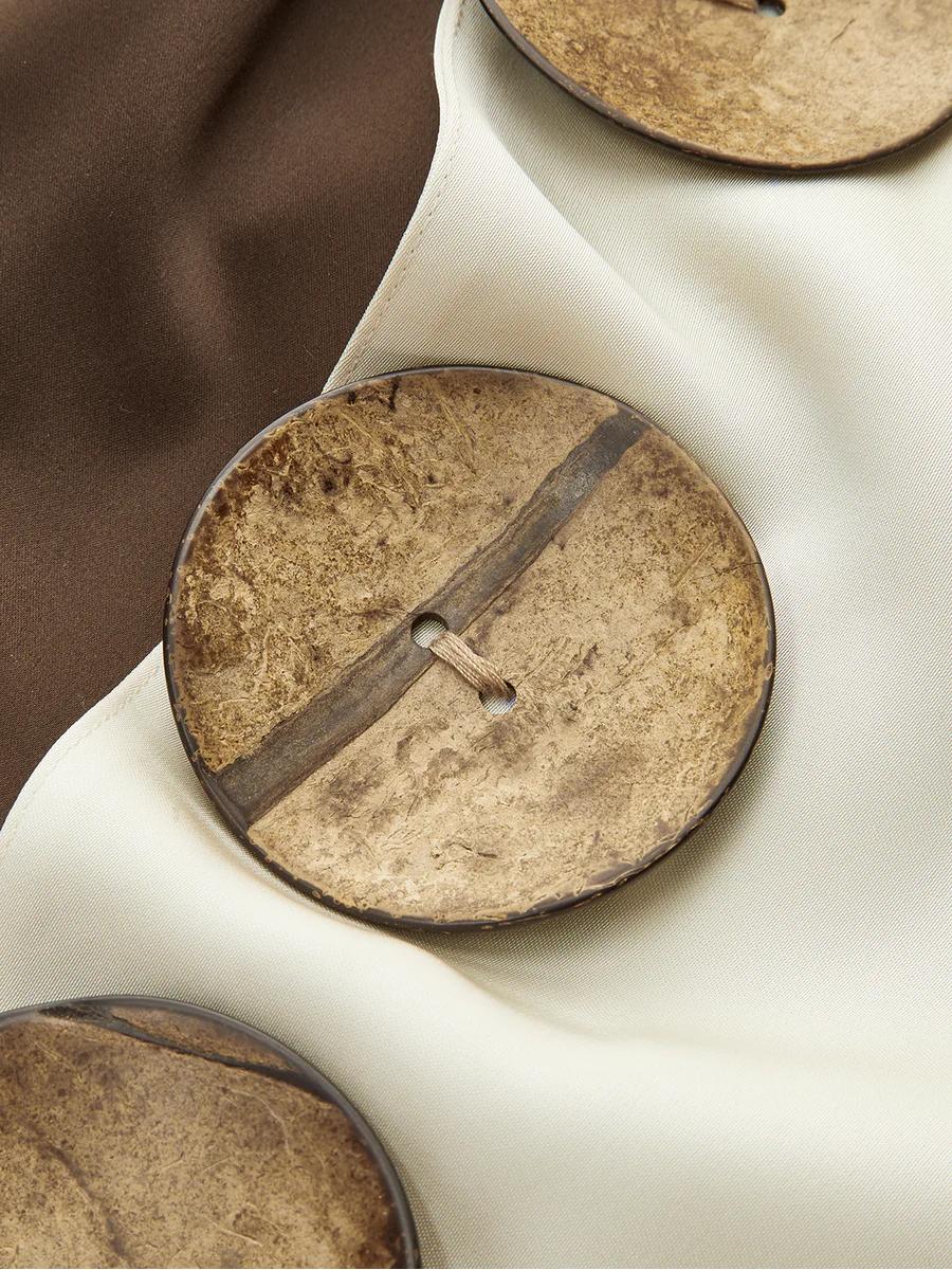 This Vintage Halter Vest fuses retro charm with modern personality. The halter neckline gracefully frames the shoulders, while the bold brown-and-white contrast splicing delivers a striking, artistic touch. Slim-fitting tailoring and the irregular triangular hem create a unique silhouette that’s both elegant and eye-catching.
