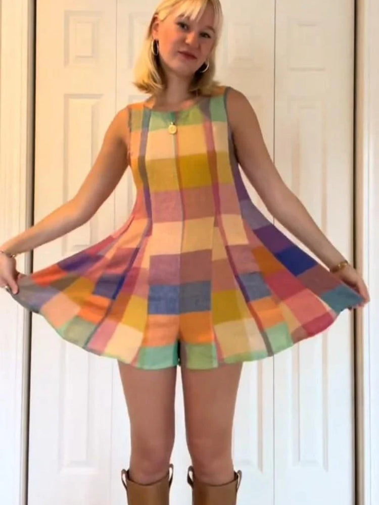 Step into sunny, playful style with the Vibrant Patchwork Sleeveless Grid Jumpsuit. Featuring a cheerful patchwork of rainbow-hued squares, this sleeveless jumpsuit keeps you cool while adding instant color to your look. The flared hem creates a twirl-worthy silhouette, and a daring open-back detail adds a touch of bold sophistication. Perfect for casual outings or summer adventures, it pairs effortlessly with boots or sandals for carefree, vibrant vibes.