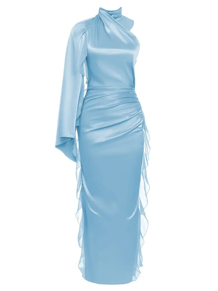 This elegant and sultry one-shoulder dress combines modern sophistication with a touch of allure. The sleek, fitted silhouette enhances your figure, while the high side slit adds an irresistible hint of drama and sophistication. The long sleeve balances the asymmetrical design, offering both coverage and a stylish contrast. Perfect for making a statement at any evening event, this dress exudes confidence and class.