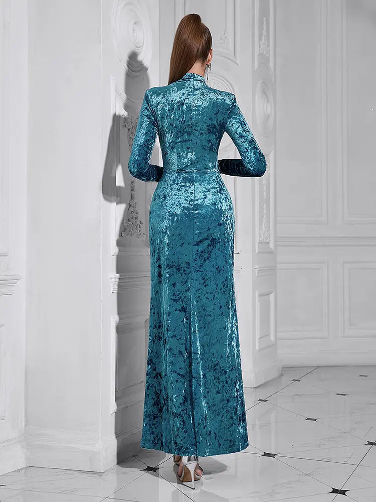 This long, minimalist dress combines elegance and sophistication. Featuring a chic high neckline, long sleeves, and subtle cutouts, it’s designed to make a statement while staying effortlessly stylish. The front slit adds allure and ease of movement, making it a must-have for any formal occasion.