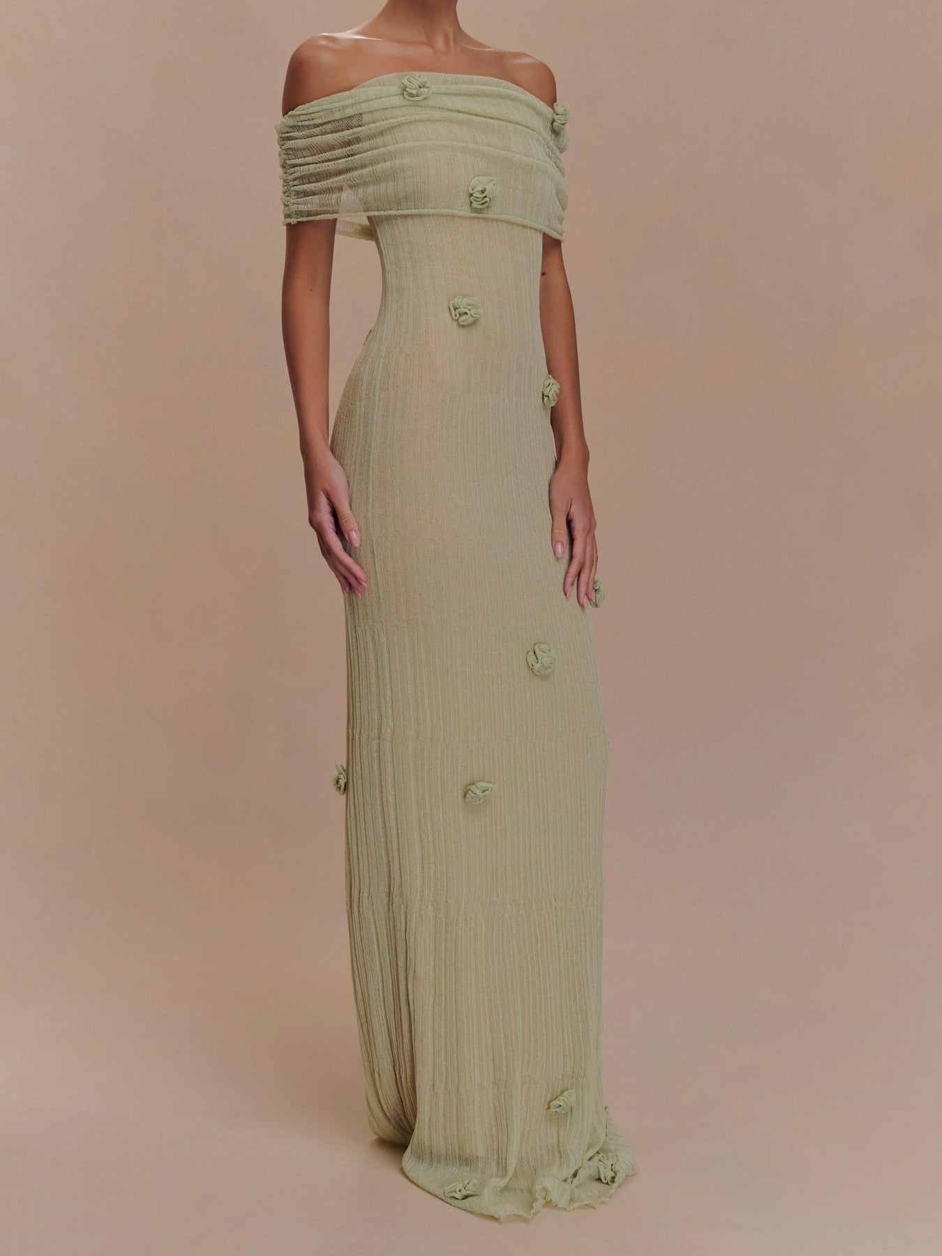 Elegant yet feminine, the Orchid Off-the-Shoulder Light Green Knitted Fishtail Maxi Dress is the perfect combination of romance and modern elegance. With delicate three-dimensional small orchids embellishing the off-the-shoulder upper body, this dress creates a charming sculptural feel with a hint of freshness and glamour. Perfect for a garden party, a seaside getaway, or any occasion where effortless sophistication is key.