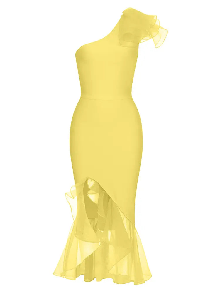 This dress is a blend of sophisticated allure and bold sensuality. The single shoulder design adds an asymmetrical edge, while the lace panels bring a delicate touch of femininity. The body-hugging, mermaid-style silhouette elongates the figure, and the fish-tail bottom creates a dramatic effect as you move. Crafted with a figure-flattering bandage material, this dress ensures you look stunning while offering maximum comfort.