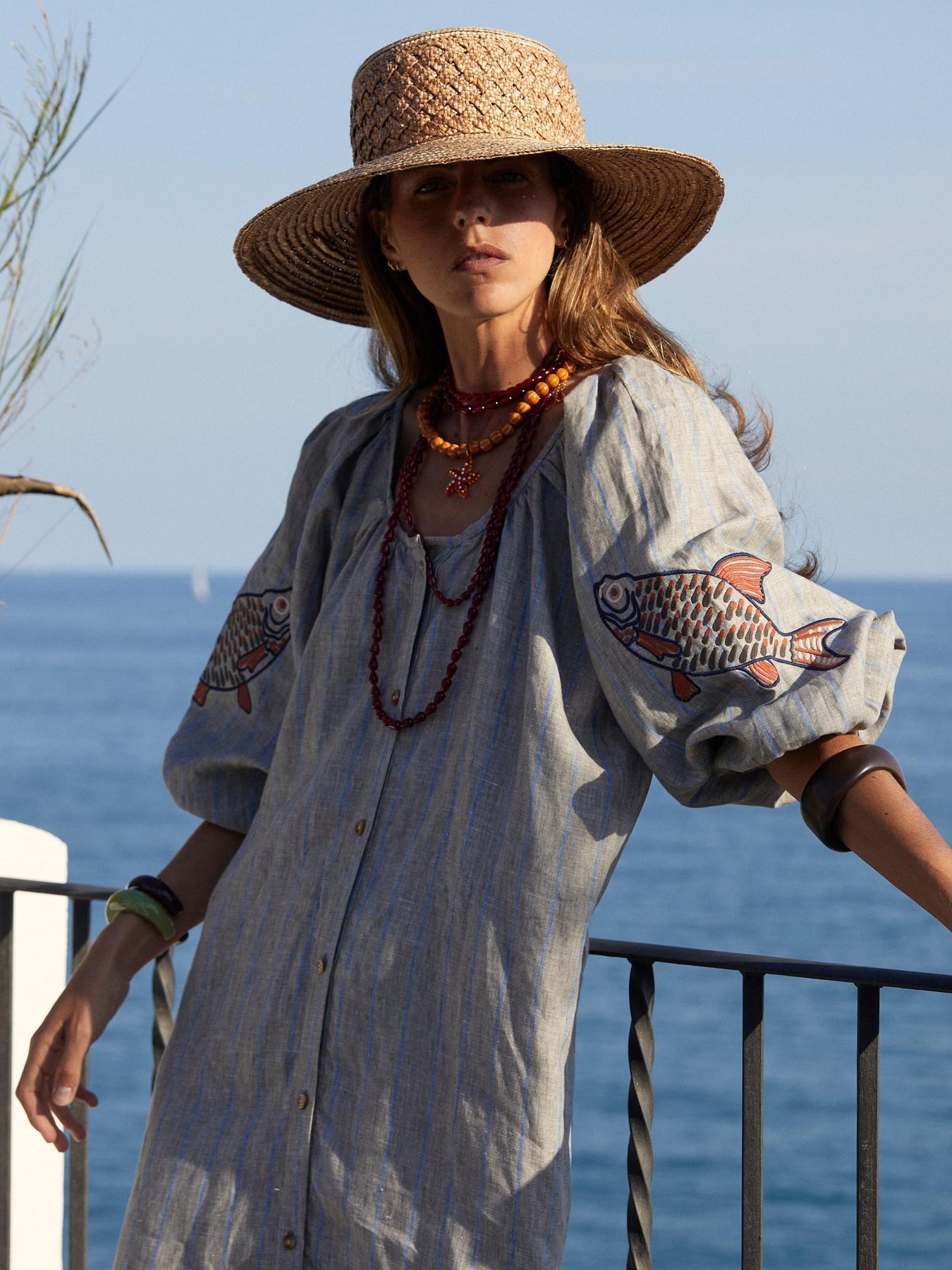 A charming blend of whimsy and sophistication, the Melite Blue Midi Dress is crafted from a breathable linen-blend fabric that brings effortless ease to everyday elegance. Featuring a ruched round neckline, playful puff sleeves, and a skirt with double front slits, this button-down shirt dress is finished with a delicate embroidered fish detail on the sleeves—an unexpected touch of personality.