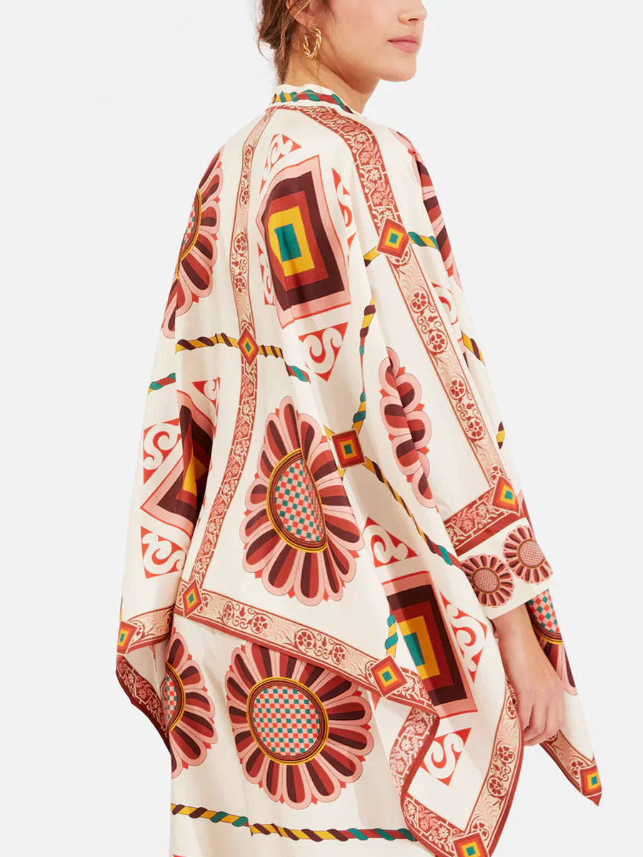 Fine Satin Floral Print Batwing Sleeve Pants Set - Off-white