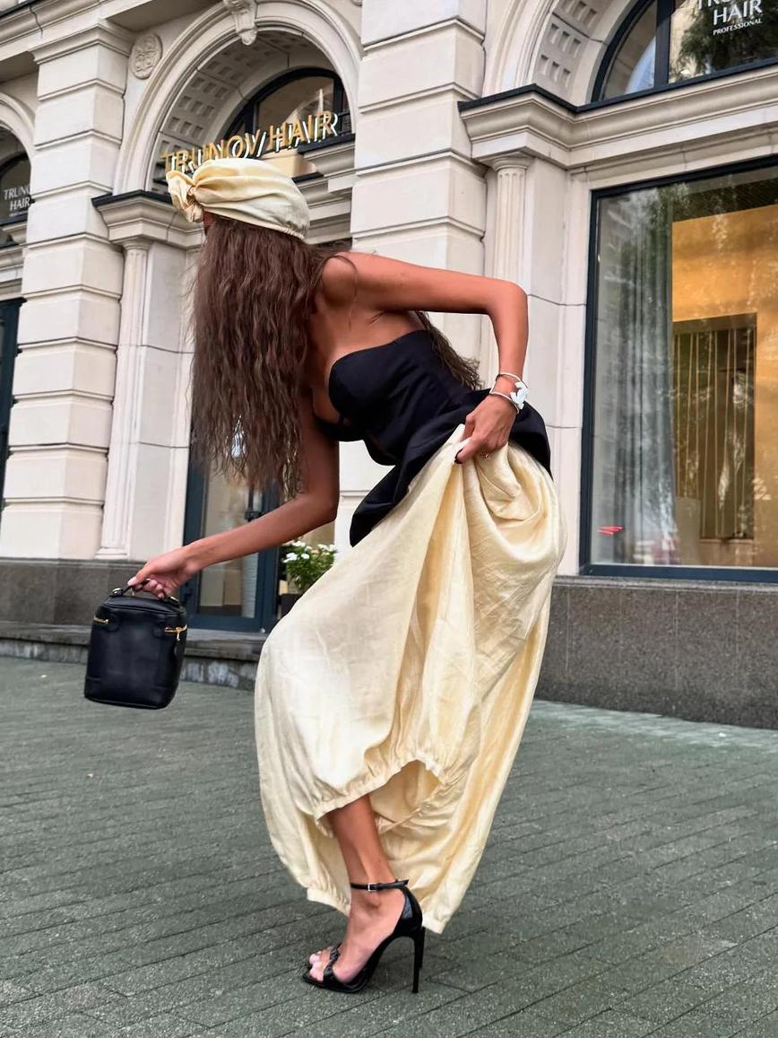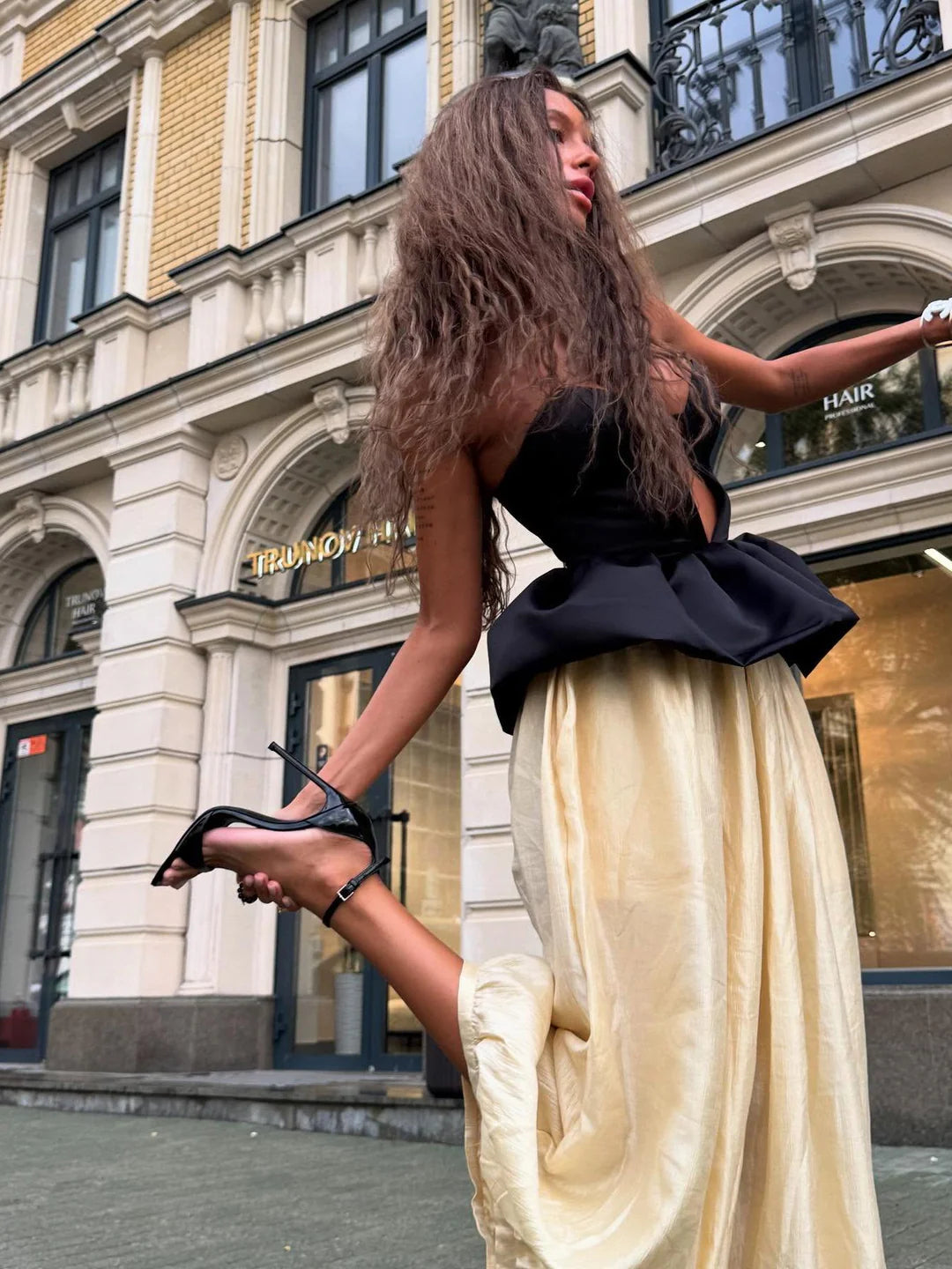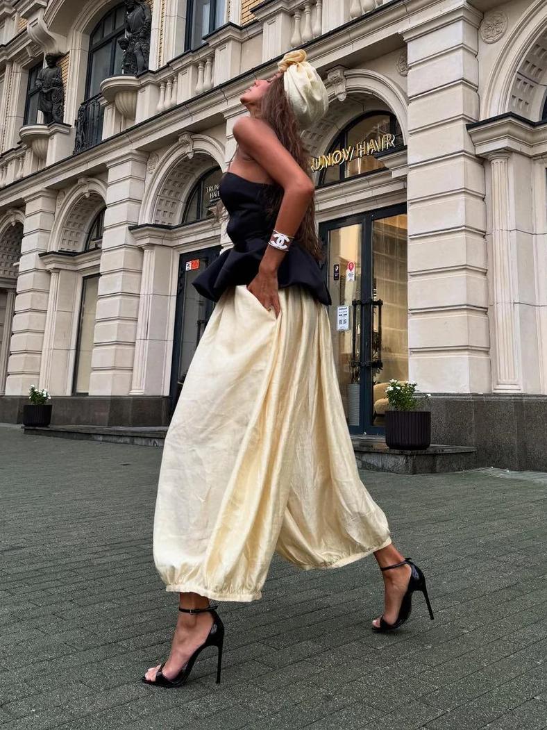 Step into timeless elegance with this French retro–style two–piece set. The cropped, waist–cinching black top highlights your figure with refined tailoring, while the beige balloon wide–leg pants balance the look with softness and fluidity. Together, they create a stylish contrast that exudes sophistication and modern charm.