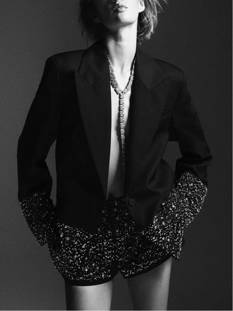 Wide section at cuffs and hem detailed with visible thread embellished with small glass beads and sparkling rhinestones. Pointed lapels, shoulder pads, and a concealed button at front. Welt chest pocket and welt front pockets. Lined.Loose-fit, single-breasted jacket in twill.