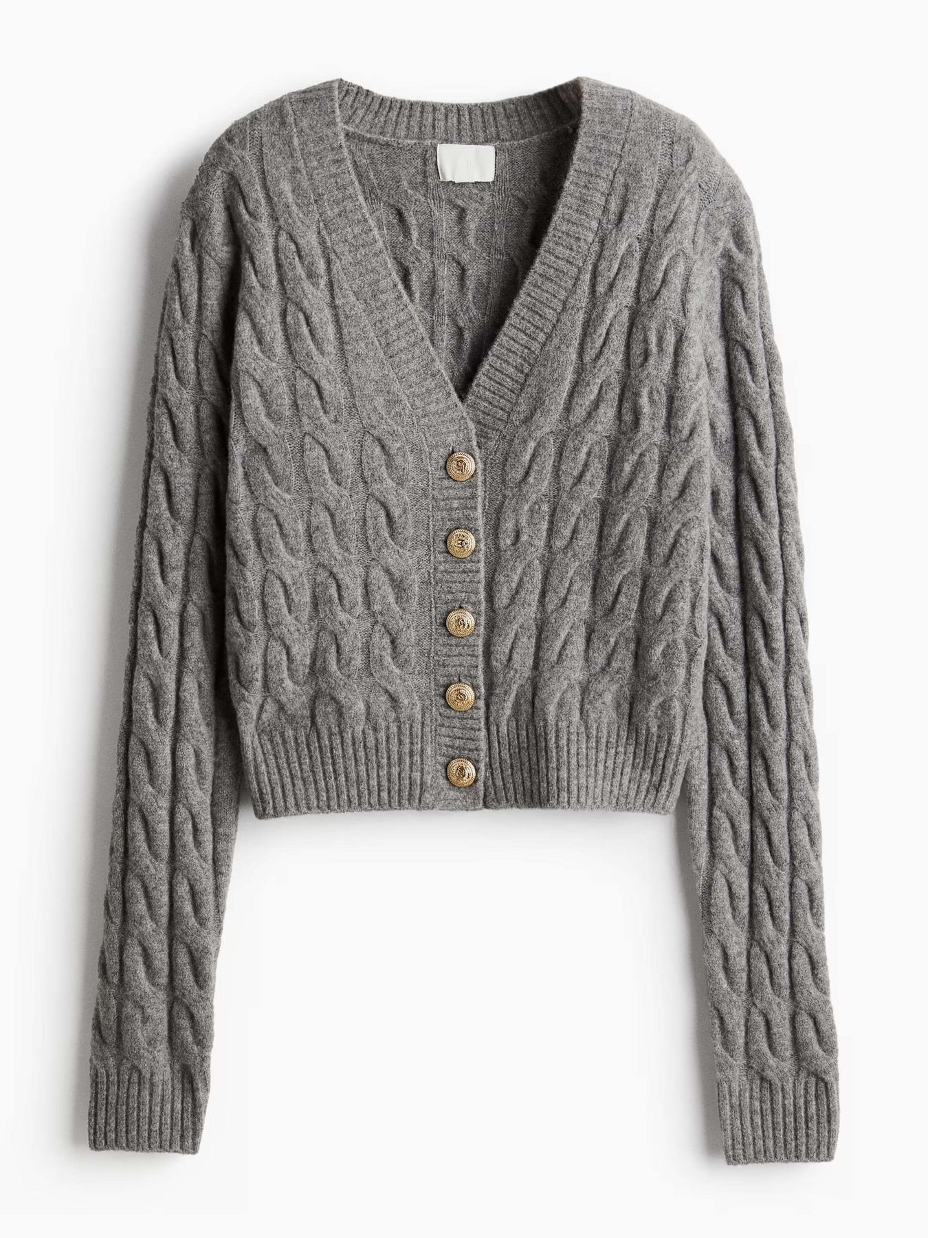 Short cardigan in a soft cable knit with wool content. V-neck, gold-colored metal buttons at front, gently dropped shoulders, and long sleeves. Ribbing at neckline, placket, cuffs, and hem.