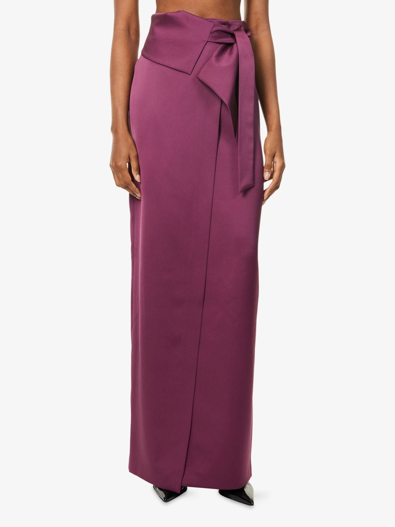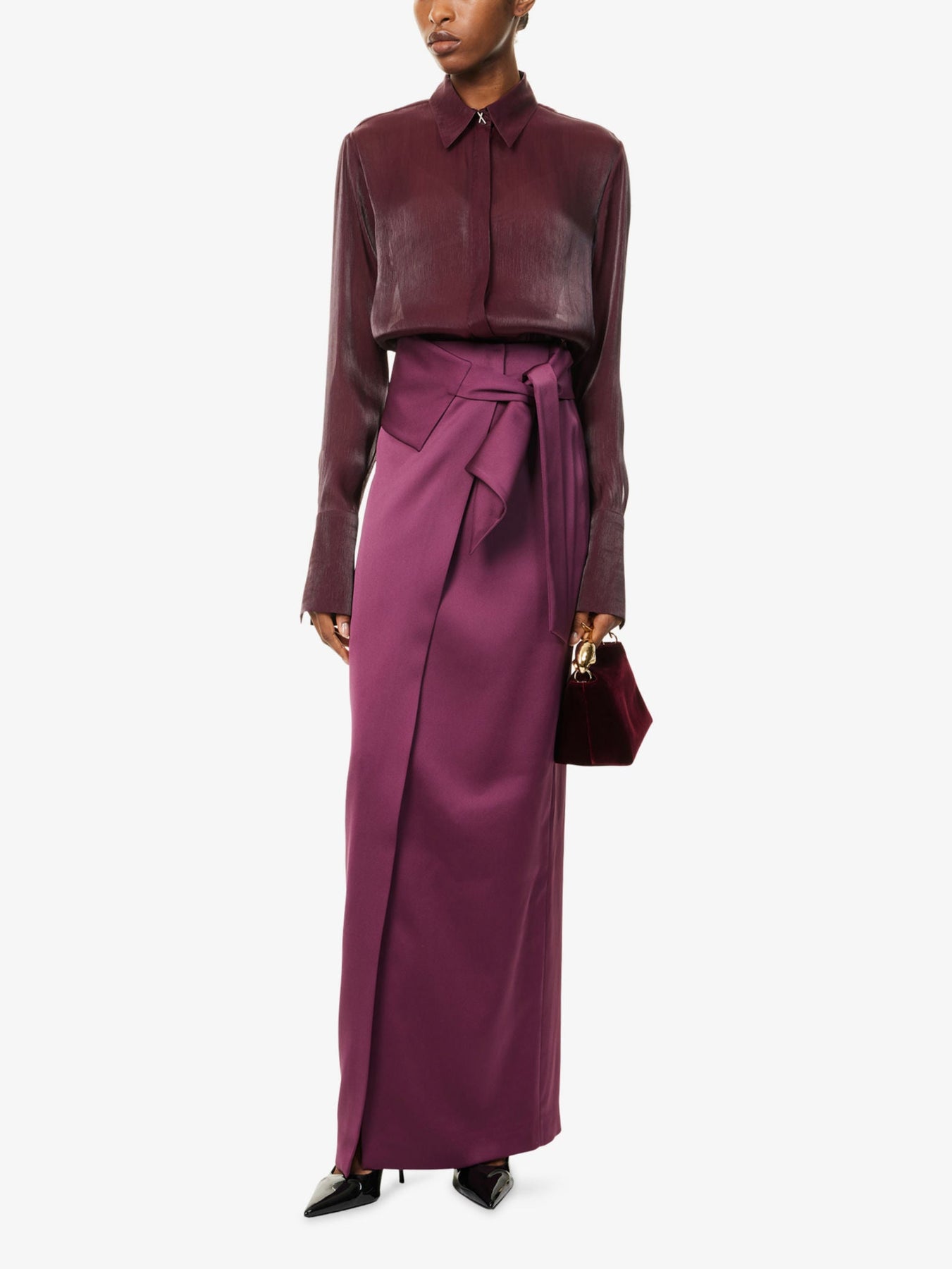 • Satin wrap maxi skirt with tied waist for a flattering fit