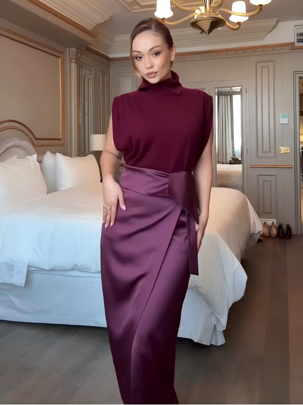The satin wrap maxi skirt ties at the waist for a flattering fit, while its flowing silhouette moves gracefully with every step. Worn together, the coordinated set creates a polished, formal look that transitions seamlessly from high-profile events to elegant evenings out.