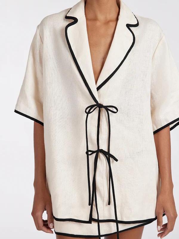 The NOIR CREAM Skirt Set combines elegance with relaxed comfort. The short-sleeve shirt features a classic collared V neckline, giving it a sophisticated edge. The contrast bind detailing and double tie closure at the front provide unique design elements that make this set stand out. With its oversized fit, it’s perfect for those seeking style and ease in one outfit.