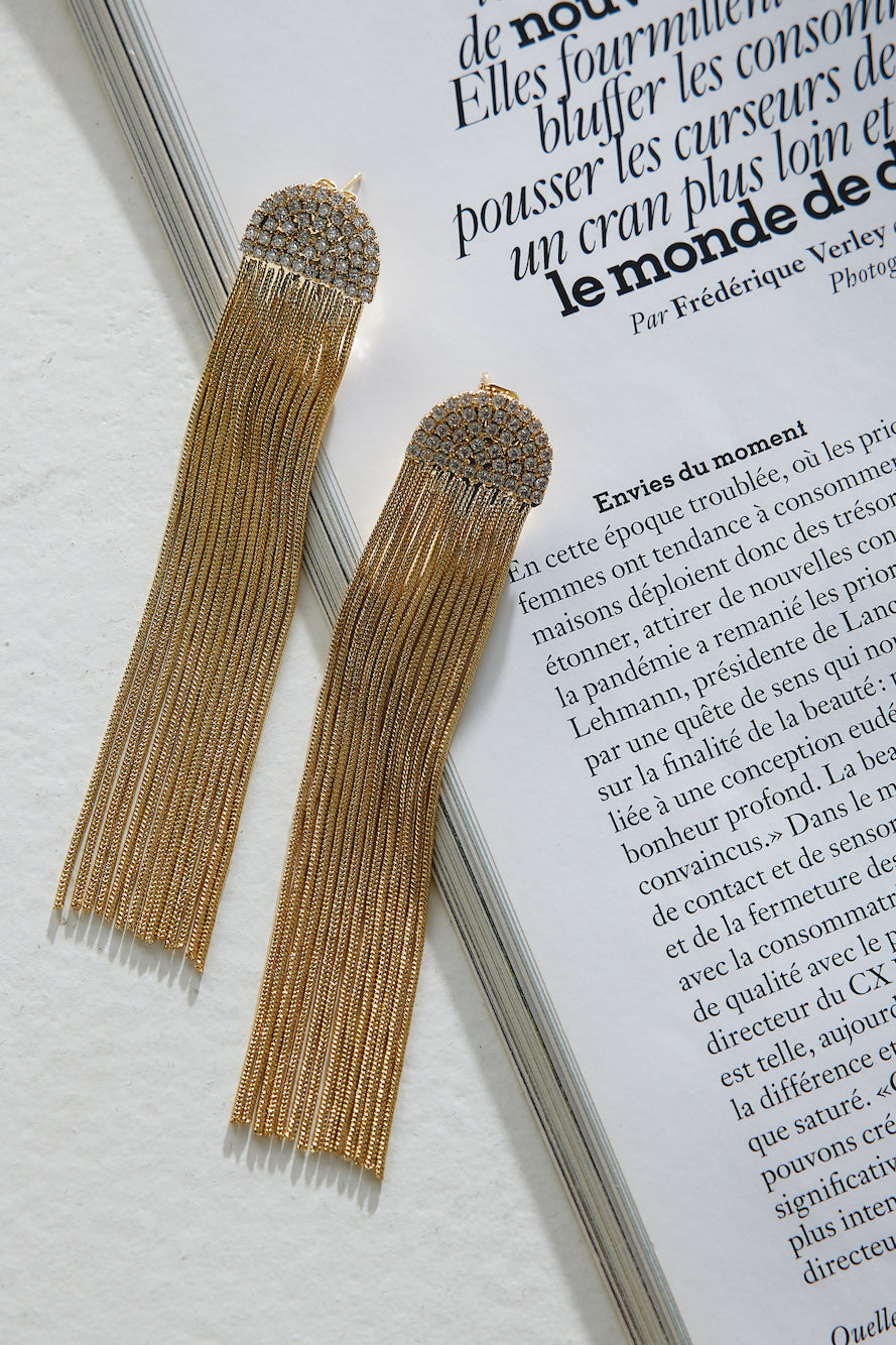 Bring the glam with the 18k Gold Plated Golden Times Earrings. Featuring a gold finish with diamantes and a fringe.